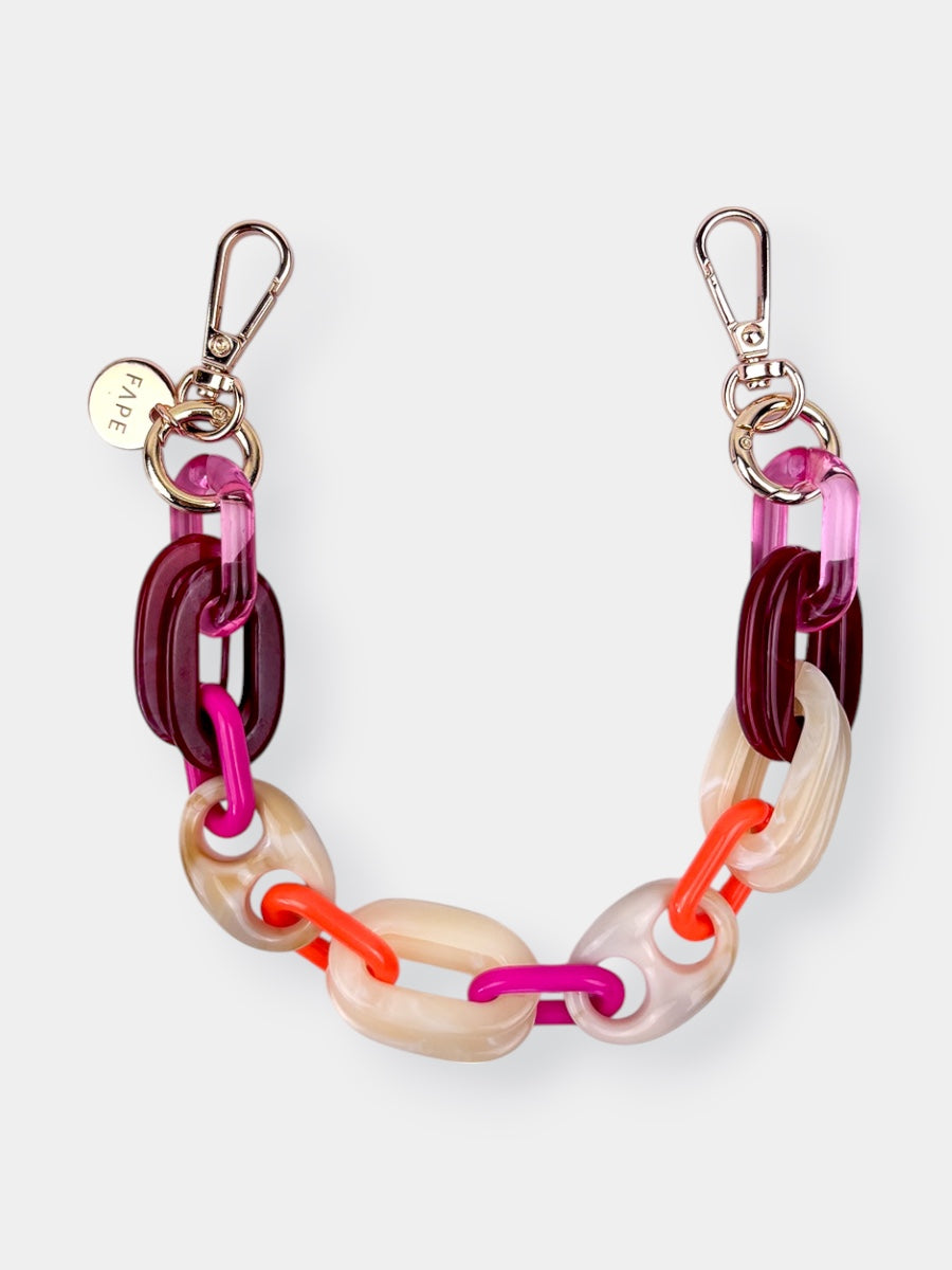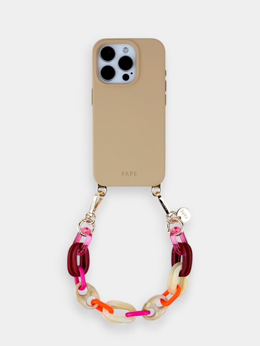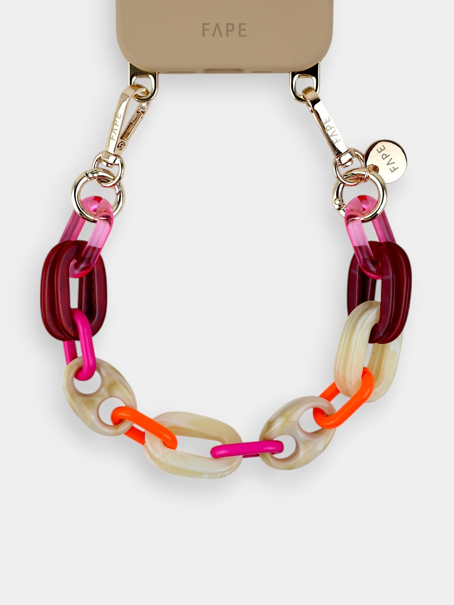 Die glänzenden Acryl-Glieder fangen das Licht auf eine ganz besondere Weise ein und verleihen deinem Look sofort eine elegante Note. Durch die kürzere Länge liegt dein Smartphone nah am Körper – sicher, griffbereit und doch federleicht, fast so, als würdest du es wie ein Schmuckstück tragen.