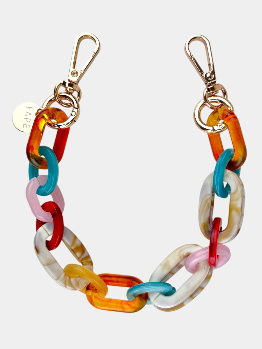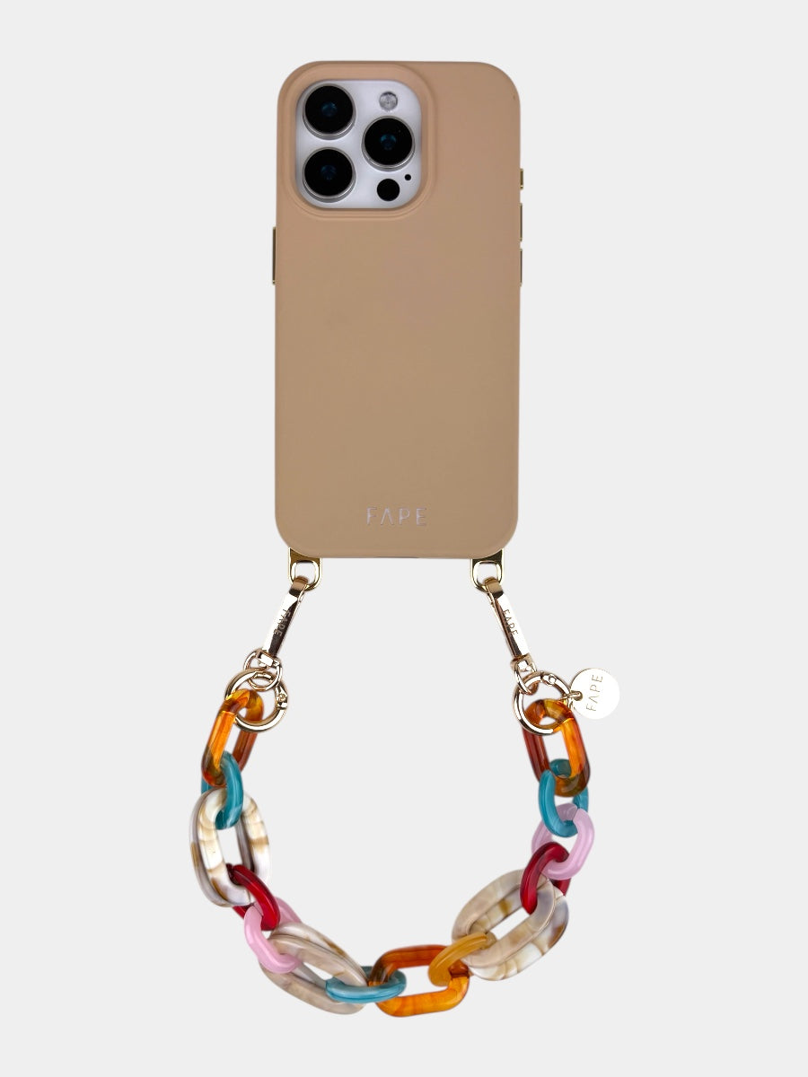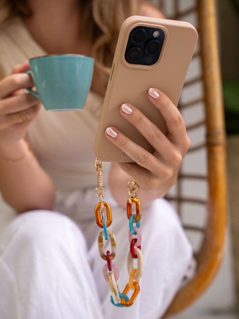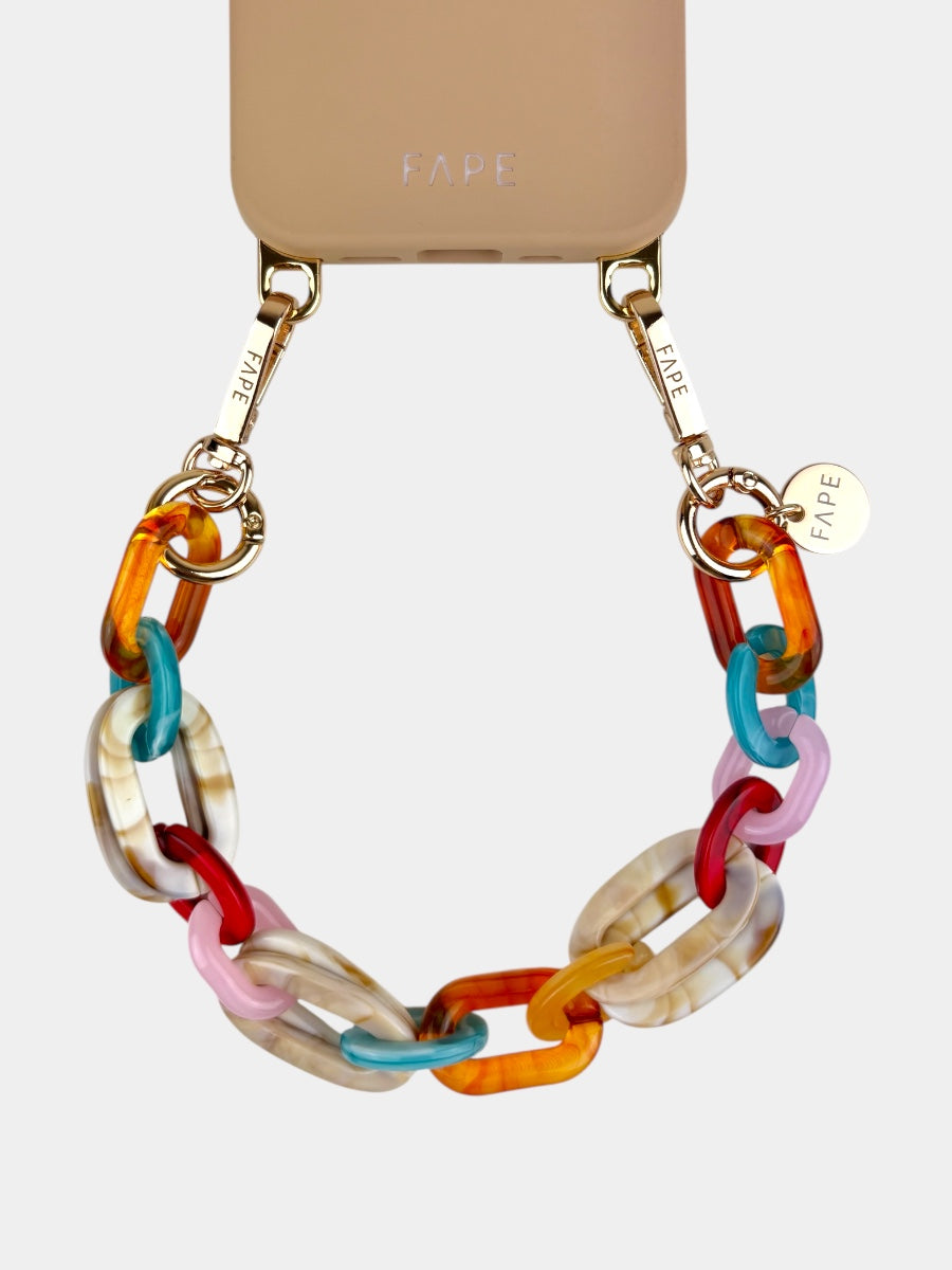Die glänzenden Acryl-Glieder fangen das Licht auf eine ganz besondere Weise ein und verleihen deinem Look sofort eine elegante Note. Durch die kürzere Länge liegt dein Smartphone nah am Körper – sicher, griffbereit und doch federleicht, fast so, als würdest du es wie ein Schmuckstück tragen.